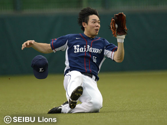 秋山は岡田の飛球をスライディングキャッチで好捕!