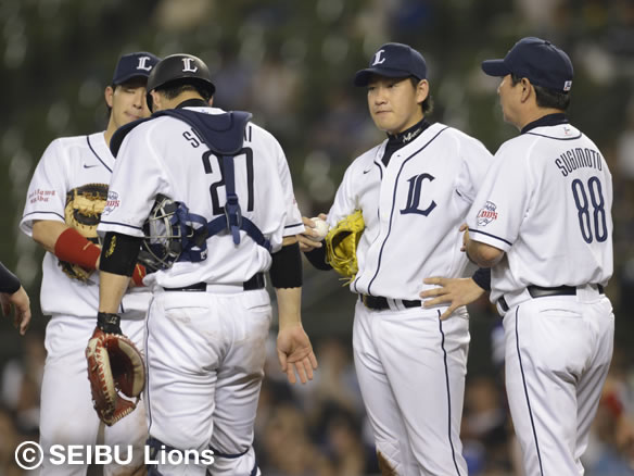 ピッチャー牧田に代わって増田がマウンドにあがる |