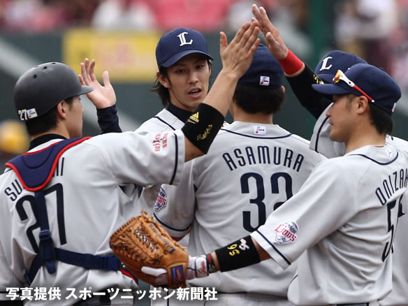 岸が最終回を無失点に抑え勝利のハイタッチ!