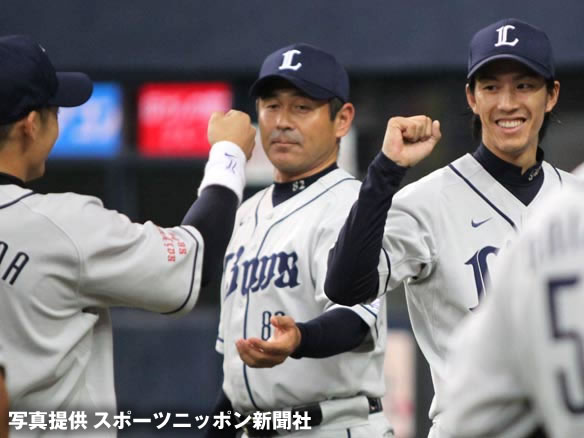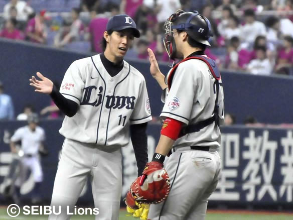 今季2度目の完封を挙げた岸は炭谷とハイタッチをかわす!