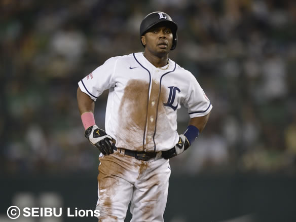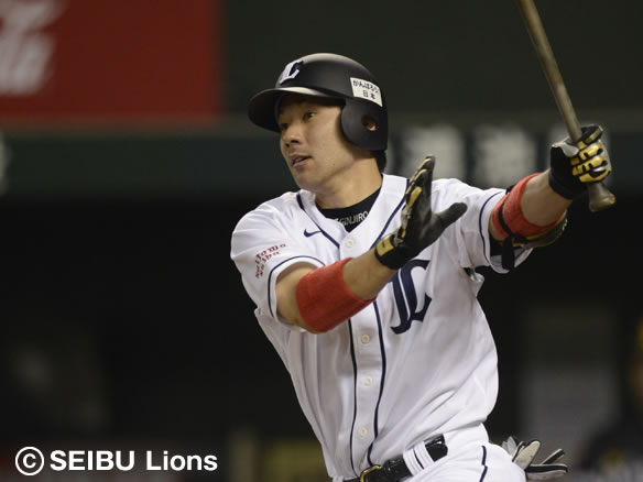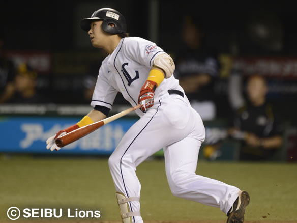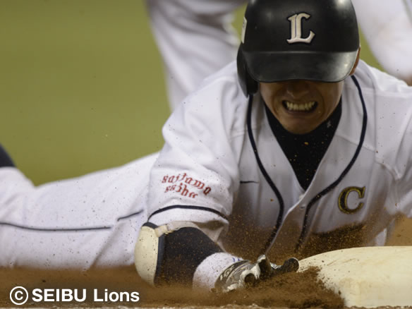 3番 栗山 右中三 2-1から内角高めのストレートを引っ張った大きな打球は、ライトのフェンスと直撃! 1塁ランナー・金子が生還。栗山は3塁にヘッドスライディングを決めた! 西2-4ソ 3塁 ![]() 2