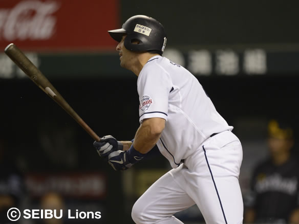 炭谷の打球はレフトフェンスへ到達する2ベースヒット