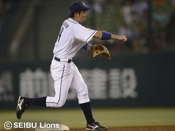 1番 岡島 遊併 ランナー1,3塁の1-1から併殺打の間に一人ランナーがかえり楽天1点をあげる 西7-4楽 2アウト |
