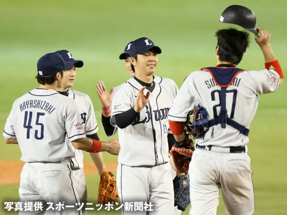 十亀が9回を投げ切りナインと笑顔でハイタッチを交わす!