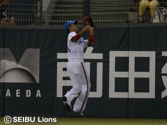 浅村の飛球はフェンス手前まで伸びるも相手の好捕に阻まれる