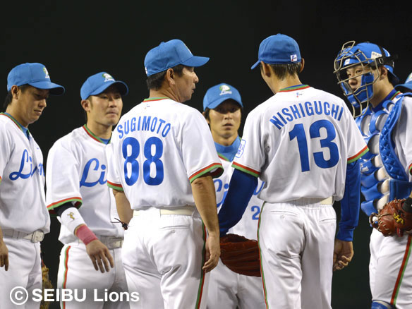 杉本コーチはマウンドへ向かい西口に声をかける