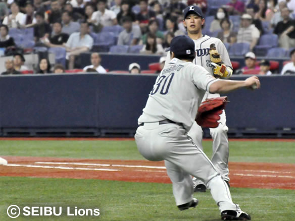 3番 栗山 四球 一度もバットを振ることなくストレートのフォアボールを選ぶ 1塁 |