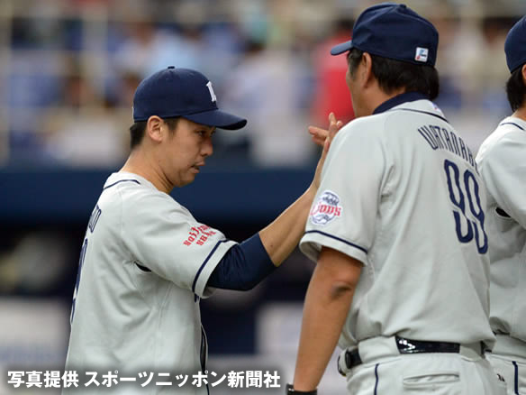7回1失点で先発初勝利の岡本洋は渡辺監督とハイタッチ!