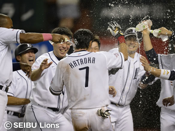 2番 片岡 左本 ランナー2塁の2-1からレフトスタンドへの2ランホームラン!! サヨナラの一発を放った片岡は、大歓声をかみしめるようにダイヤモンドを回り、ホームで手荒い祝福を受ける!! 西4-2楽 ゲームセット ![]() 4