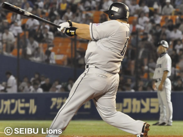 6番 サブロー 四球 外角のカーブを見送りフォアボール。ライオンズ、満塁のピンチをまねく 満塁 |