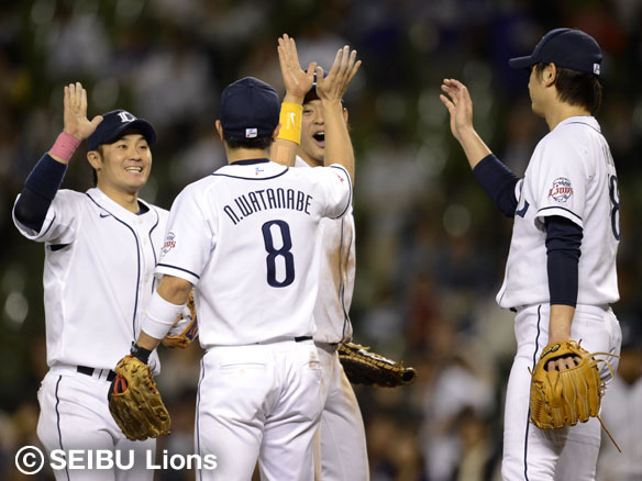 投手 サファテ ピッチャーサファテに代わって涌井がマウンドにあがる 守備交代:ライト熊代 守備交代:サード渡辺直 |