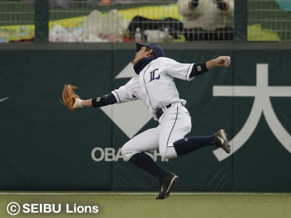 1番 菊池 右飛 右中間の深い所に打球を飛ばされたが、追いかけたライト・斉藤がスライディングキャッチ! |