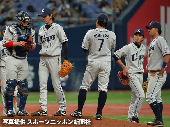 岸を落ち着かせるべくマウンドに集まる内野陣
