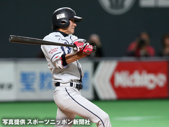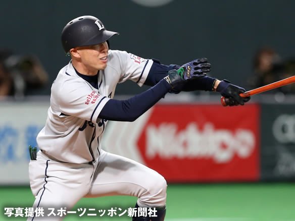 7番 金子侑 右安 ライトへのヒットを放つ 1塁 |