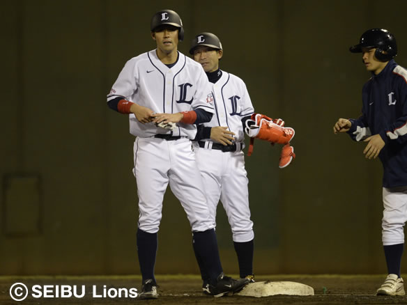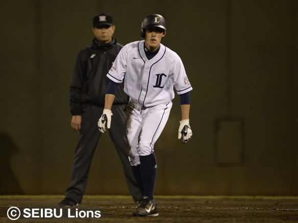 投手 牧田 1番 根元 左安 レフトへのヒットを放つ 1塁 |