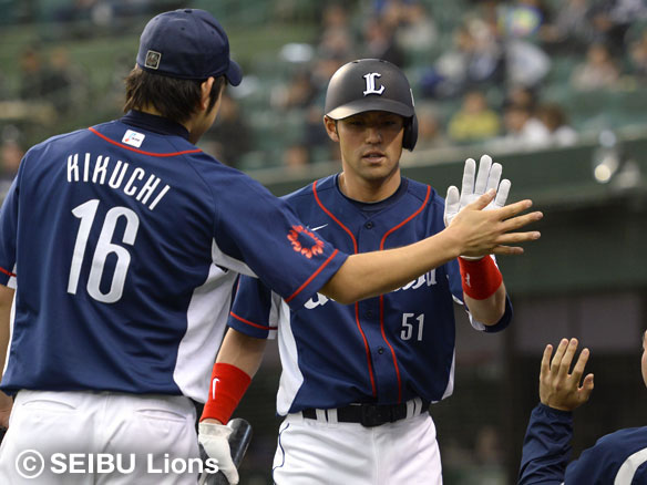 先制の一発を放った木村は生還し菊池とハイタッチ!
