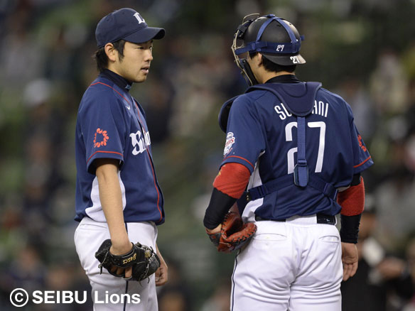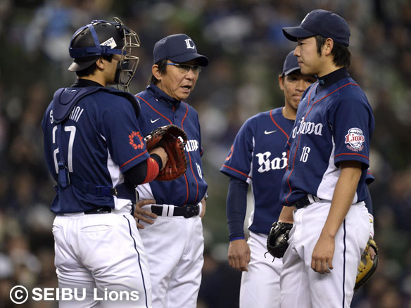 清川コーチはマウンドへ向かい菊池に助言を送る