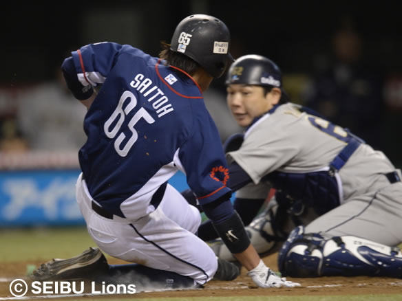 炭谷のスクイズに斉藤が本塁突入するも及ばず