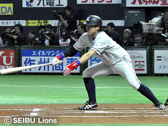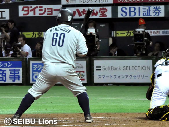 5番 中村 右越二 2アウト1,2塁の2-2からホームランまであと少しというフェンス直撃の当たり!センターへの先制タイムリーツーベース!獅子の主砲が帰ってきた! ソ0-2西 2塁 ![]() 0