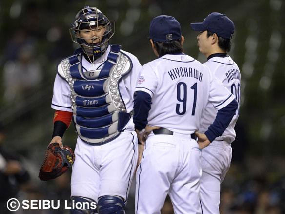 清川コーチと炭谷がマウンドへ向かい野上に声をかける