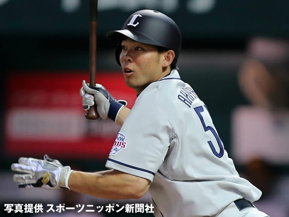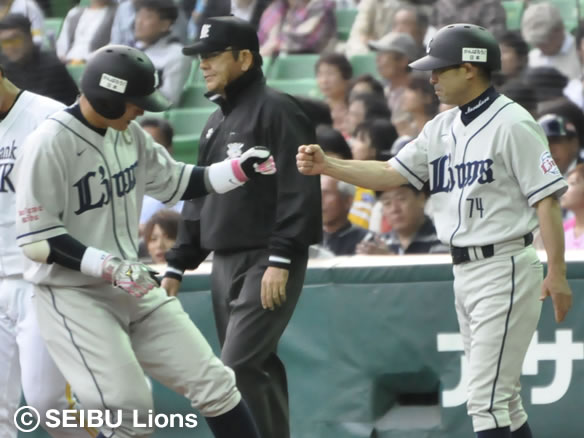 7番 秋山 左安 ランナー1,2塁の1-0からレフトへのタイムリーヒットでライオンズ同点!秋山が昨日に続くタイムリーを放ち、復調をアピール! ソ2-2西 1,2塁 ![]() 2
