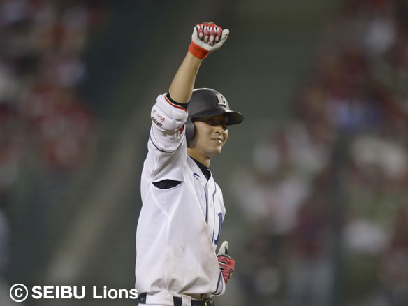 7番 金子侑 左翼二 ランナー2塁の1-1からレフトへのタイムリーツーベースでライオンズ勝ち越し!2塁ベースへ到達した金子侑は、笑顔で力強いガッツポーズを披露! 西5-4広 2塁 ![]() 5