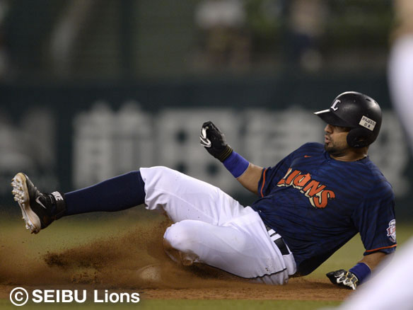 メヒアは右中間へ大きな当たりを放ち2塁へ滑り込む!
