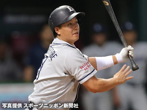 巧みな右打ちで安打を放つ渡辺直!