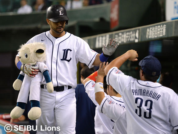 ダメ押しの一発を放ったメヒアは山川とハイタッチをかわす!