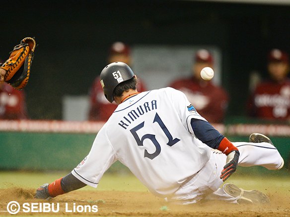 炭谷の安打で木村が本塁へ滑り込む!