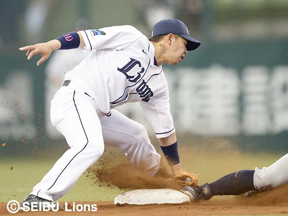 炭谷の鋭い送球を受け走者をアウトにする浅村