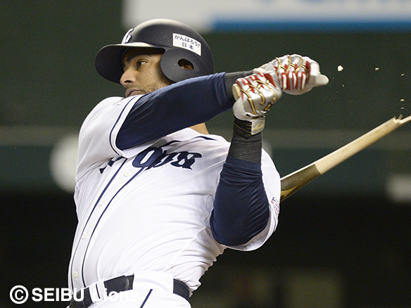 5番 メヒア 中安 0アウト1,3塁の3-2からバットを折りながらもセンター前へ運ぶ!タイムリーヒットで貴重な追加点を挙げる! 西4-2日 1,2塁 ![]() 4