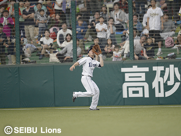 右中間への飛球を秋山がランニングキャッチ!