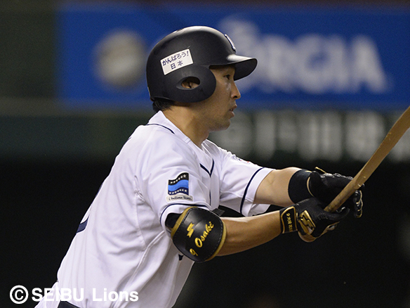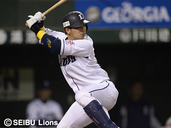 炭谷がレフト方向へ安打を放ち追加点への好機を演出する