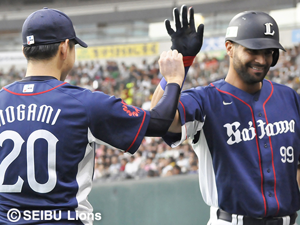 逆転ホームランを放ったメヒアは野上とハイタッチ!