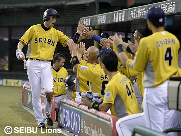 プロ初ホームランを放った外崎が笑顔で仲間と喜び合う!
