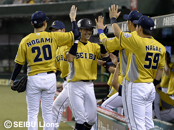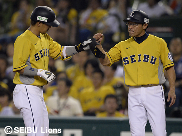 8番 外崎 左本 2-0から思い切り引っ張り上げた打球は、高く上がってレフトポールの上付近を通りスタンドへ!判定はファウルとなるも、ビデオ判定の結果ホームランに覆った!プロ初スタメンの外崎がプロ初ホームラン!! 外崎は笑顔でベンチのメンバーとタッチを交わす! 西3-1日 ![]() 3