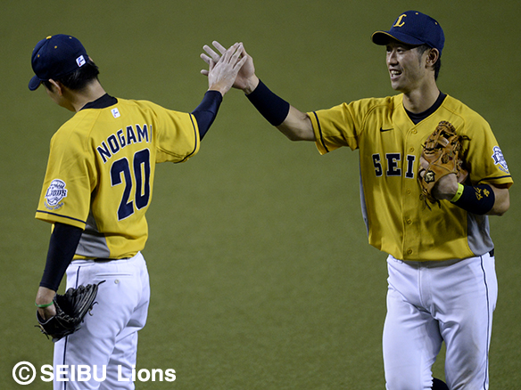 安定した守備で併殺に打ち取った外崎が野上とタッチを交わす