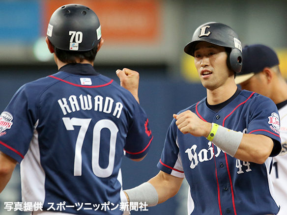 タイムリーを放った外崎は河田コーチとタッチを交わす!