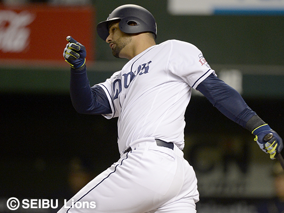 3番 メヒア 中越安 打ち返した打球は左中間を破り、3塁ランナーが生還!劇的なサヨナラ勝ちを決めたメヒアは、指を天に突き上げる! 西5-4オ ゲームセット ![]() 5