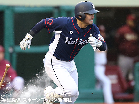 6番 森 遊安 ランナー3塁の3-2からボテボテのゴロとなるも、森が全力で走り内野安打に!この間に3塁ランナーが生還! 楽13-2西 1塁 ![]() 12