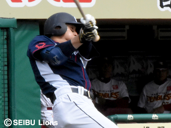 5番 栗山 左安 レフトへのヒットを放つ 1,3塁 |