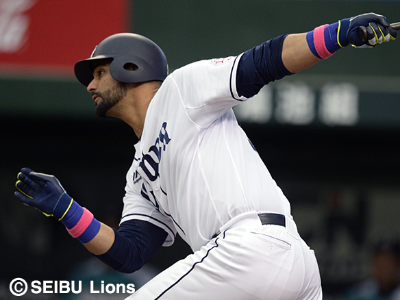 3番 メヒア 中安 ランナー1,3塁の2-2から外角のスライダーにバットが届き、フワリと上がった打球がショートの頭上を越えた!3塁ランナーが生還し同点!メヒアの大活躍にスタンドから大きな歓声が上がる!! 西2-2日 1,3塁 ![]() 2