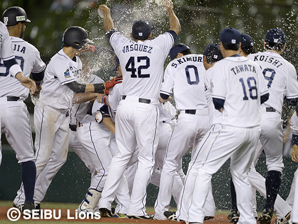 サヨナラタイムリーを放った秋山を囲み喜ぶナイン