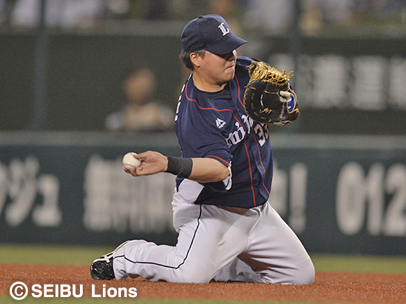 一二塁間のゴロを好捕し一塁へ送球する山川