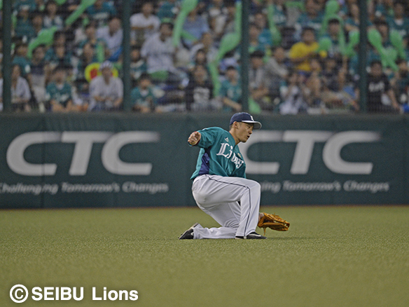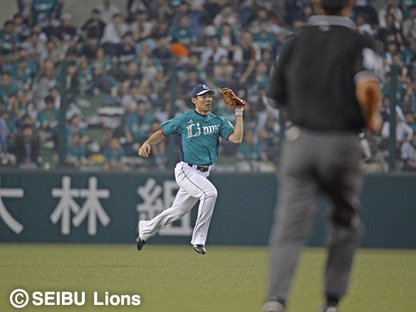 秋山が猛然と走り浅い飛球をランニングキャッチ!