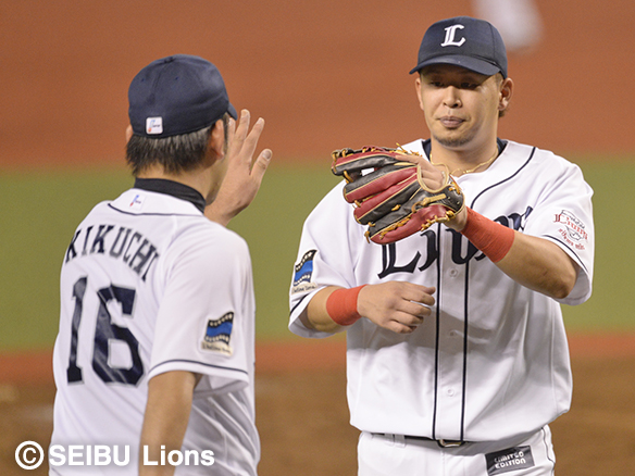菊池が併殺を完成させた浅村とハイタッチ!