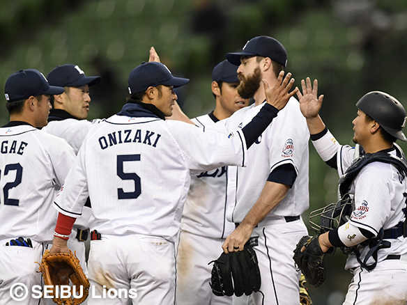 本拠地で連敗を止めハイタッチを交わすナイン