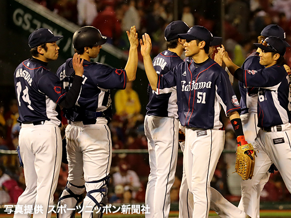 投手 菊池 守備変更:浅村→ファースト 守備変更:田代→レフト 守備変更:水口→ 守備変更:外崎→セカンド |