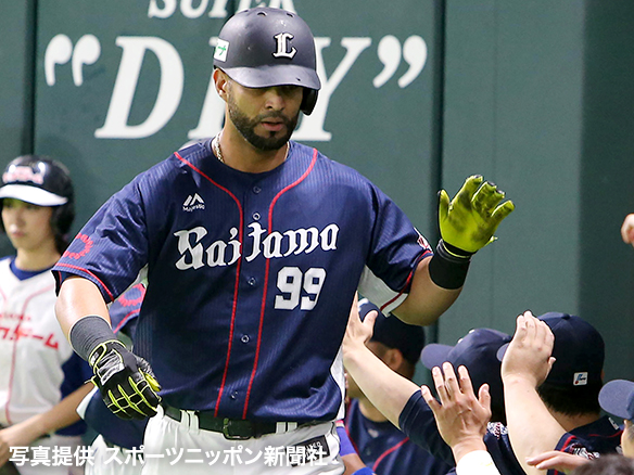 逆転ホームランを放ったメヒアがナインとハイタッチを交わす